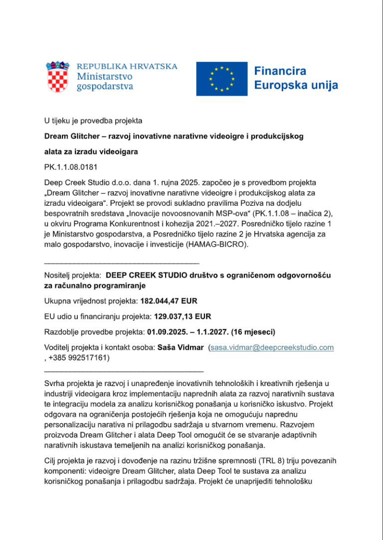 Deep Creek Studio d.o.o. dana 1. rujna 2025. započeo je s provedbom projekta „Dream Glitcher – razvoj inovativne narativne videoigre i produkcijskog alata za izradu videoigara“. Projekt se provodi sukladno pravilima Poziva na dodjelu